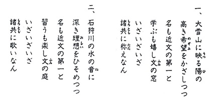 近文とはアイヌ語の「チカップニ」から由来しており,本校はこの地域で最初に出来た学校であることから,この名がつきました。現在,開校128年目を迎えた歴史ある学校です。前庭には80周年を記念して建立された時計台があり,「惜陰」の文字が刻まれています。(意味:少しの時間も惜しんで努力する。)