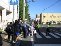 旭川中央警察署の方による交通安全啓発活動を実施しました。横断歩道を渡るときのハンドサインなどについて、下校途中の子どもたちに話していただきました。7条児童玄関前の横断歩道をキャラクターと共に手をあげて渡る練習をしました。夜間に光るワッペンの配付もありました。日暮れが早くなり、帰宅時刻には薄暗くなることが多くなりました。交通安全の意識を今後も高めていきます。