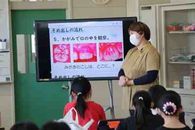 歯科保健指導(5年生) 〇2/6 歯の健康教室で、歯科衛生士さんが来校し、歯科指 導をしてくださいました。 〇子どもたちは、染め出しをして、自分の歯みがきの効果を確 かめていました。 〇自分の健康のために、しっかり歯みがきしてください。