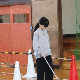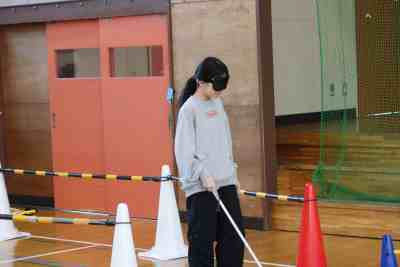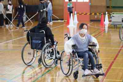 総合的な学習の時間(心のバリアフリー) 〇2/20 5年生が総合的な学習の時間で車いす体験や高齢者 体験をしました。 〇お年寄りや障がいを持つ人の普段の生活について理解し、偏 見をなくすことや自分たちが作る壁を取り除く(心のバリア フリー)について考えるための活動です。 〇車椅子を利用する人や目の不自由な人には、勾配や段差が大 変つらいことが分かりました。