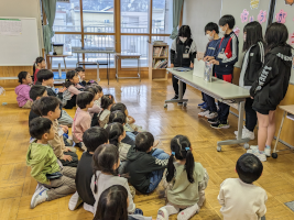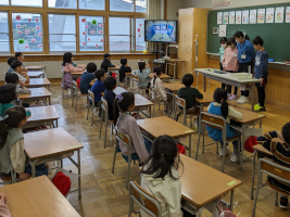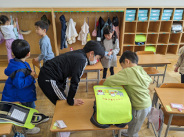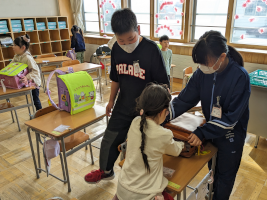 1年生のお世話(6年) 〇4/12 朝、1年生の教室をのぞいてみると、6年生がお世 話をしに来てくれていました。 〇どんどん自分でできるようになってきてはいますが、入学し てまだ1週間も経っていない1年生です。 〇1年生が困っていると、6年生が近くに来て話を聞いてくれ ます。 〇6年生のやさしさを感じながら、1年生は元気に過ごしてい ます。