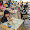 初めての給食(1年) 〇4/11 今日から1年生の給食が始まりました。 〇ドキドキ、わくわくの1年生。 〇いよいよ給食時間です。 〇給食の準備は、教職員が行いました。 〇献立は「白飯、牛乳、カレー、福神漬け、黄桃ミックス」で した。