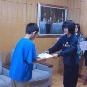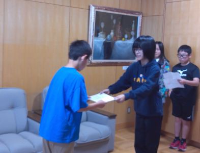 「縦割り班 名刺交換ゲーム」の表彰式 〇10/3 児童会主催の「縦割り班 名刺交換ゲーム」の表彰式 が、校長室で行われました。 〇学校1位と、学年1位の子どもたちに、児童会から賞状が渡 されました。 〇副賞として、校長先生からは、校長先生の似顔絵付きの「や れば できる!」名刺が渡されました。 〇これからも、たくさんの人と仲良くなりましょうね!