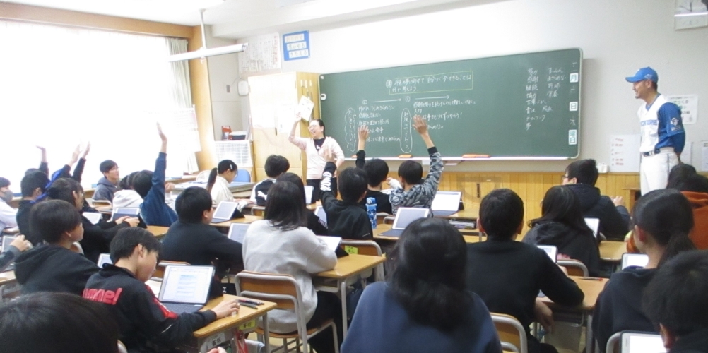 〇授業では、自らの体験談をとおして、子どもたちに将来の夢