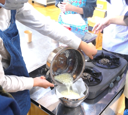 雪印メグミルク 食育出前授業(5年) 〇11/25 「雪印メグミルク」から講師を招き、5年生が食育 出前授業で「骨の成長」について学習しました。 〇骨の仕組みとカルシウムの役割について学び、カルシウムの 大切さを考えました。 〇牛乳を少し苦手に感じている子も、今日からは頑張って飲ん でみようかなと感じられる授業でした。 〇最後は、各学級でグループに分かれて、自分たちで牛乳から カッテージチーズを作って食べました。チーズを作る際に出 た「ホエー」も飲みました。