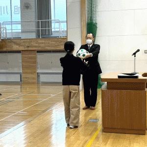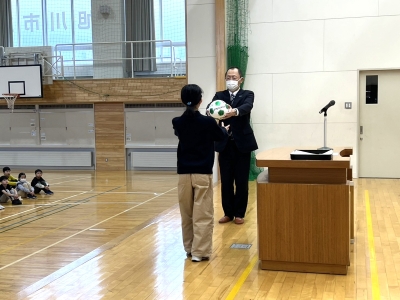 サッカーボールの寄贈(全校) 〇12/25 明治安田生命様が実施されている「未来世代応援ア クションwithカズ」キャンペーンの一環としまして、本校に サッカーボールを寄贈していただきました。 〇終業式の前に、明治安田生命旭川支社旭川北営業所の山川営 業所長より、全校児童の前で、児童会長にボールが手渡され ました。 〇大切に使わせていただきます。ありがとうございました。