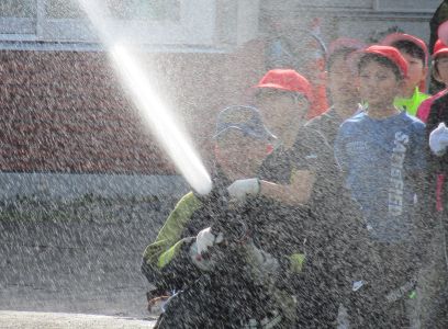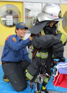 〇放水の体験をさせてもらったり、消防服を着させてもらった