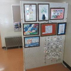 美術部の作品が配膳室前に展示されています。給食時以外あまり通らない目立たない場所ですが、クリスマスや冬などをテーマにした作品を見て、ホッと心が安らぐのです。そして、学校には勉強には直接関係のない、そういった潤いの環境も大切だなぁと思うのです。すき間時間にぜひ、見に行ってください。