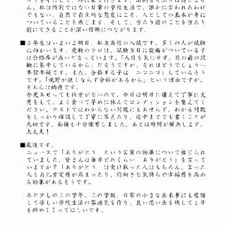 さて、明日は3年生がいよいよ私立高の入試。今日は集会を開いて最終確認をしました。玄関では3年生の先生が励ましの声をかけつつ、上靴を持って帰るよう指導しています。体調を整えて、朝はゆとりを持って(高校前で渋滞することがよくあります)会場に向かってください。