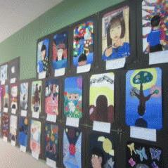 3年の美術作品「今の自分を見つめ表そう」を見ると、表現の豊かさに驚きつつ、15歳の悩みや迷い、複雑に揺れる思いが伝わり、一枚一枚をコメントと照らしながら鑑賞しています。