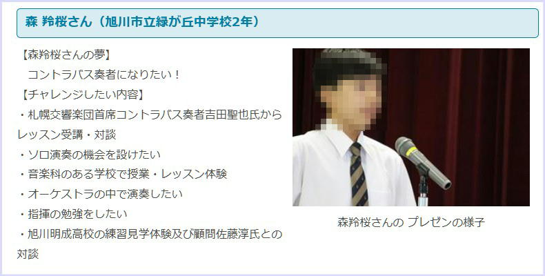 あさひかわっ子☆夢応援プロジェクトで夢語る! 今年度の「あさひかわっ子 夢応援プロジェクト」において 本校の森くんが応募し、「将来の夢について」プレゼンをしました。 森くんは、将来、コントラバス奏者になることが夢だそうです。 夢を叶えるために、こつこつと努力を続けてくださいね。