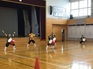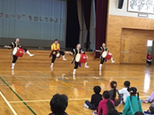 エイサーを観賞して参加しました 11月19日(水)に旭教エイサーサークルの皆さんが来校され、沖縄の伝統芸能であるエイサーを披露していただきました。 音楽に合わせながらの勇壮な演舞に、子どもたちは魅了されていました。 一緒に「フェーシ」(かけ声を出すこと)、「カチャーシー」(かきまぜる動きをする踊り)にも楽しく参加しました。