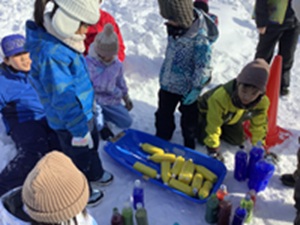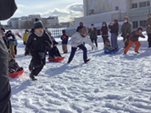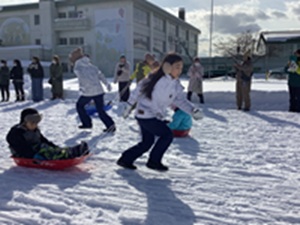 縦割り班ごとのチームで、宝探しとそりリレーを行い、熱戦を繰り広げていました。