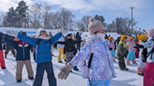 2月9日に旭川冬まつり会場で行われた耐寒ラジオ体操に1・2年生の児童が参加しました。