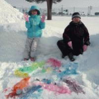 【2014/2/27 「☆星の世界☆」(3・4年生図工)】 図工の時間に,3・4年生は外で合同で作品を製作しました。 3年生は,カラフルな氷を使って星形を作りました。(単元「自然からのおくりもの」)氷は,給食の牛乳パックを使って氷らせました。4年生は,紙粘土でその星形に住む住人を作りました。(単元「ここにきっといるよ」)その住人は,この星を守り,そりに乗ったり,剣を持ったりしています。 想像力豊かな作品に,あかまつの木もうれしそうです。