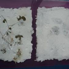 【2014/2/19 「ハガキ作り」(1・2年生)】 1・2年生は,生活科で「ハガキ作り」をしました。 給食で飲んだ牛乳の紙パックを活用しパルプを作り,木枠と網を使って紙漉をしました。校庭で採集した四つ葉のクローバーや草花も漉いたハガキに載せてパルプをかけ,世界に1枚だけのハガキが完成しました。
