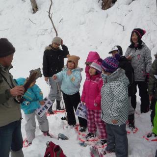 【2014/2/28 「かんじきウォッチング」】 今年も,NPOグランドワーク西神楽の協力により,「かんじきウォッチング」を行いました。西神楽フットパスに行き,講師の先生から冬の動植物の様子を教えていただきました。今年は動物の足跡があまり見られませんでしたが,直線上に歩くキツネの足跡を見たり,エゾリス・シマリス・モモンガなどの標本を観察したりするなど,1年に1度の冬のかんじき体験を楽しみました。