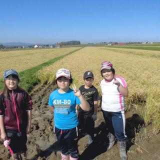 5月28日に田植えをしてから4か月が経ちました。本日,地域の米づくり名人の方の水田で,稲刈りを体験しました。まず初めに,大きく生長し,稲穂が頭を垂れるぐらいに実った稲の観察をしました。それから,名人の指導の下早速稲刈りに取り組みました。昨年経験している4年生は慣れた手つきで。また,初めての3年生は,意欲満々に鎌を手にサクサクと上手に稲を刈り取っていきました。田植え体験・稲の観察・農園の見学,そして,今回の稲刈り体験を通して,農家の仕事に触れ,旭川市でおいしいお米が作られるのは,旭川市の恵まれた土地・水・気候だけでなく,農家の方がいろいろな工夫や努力をしておいしいお米を食べてほしいという願いがあることが要因であることを学習できました。