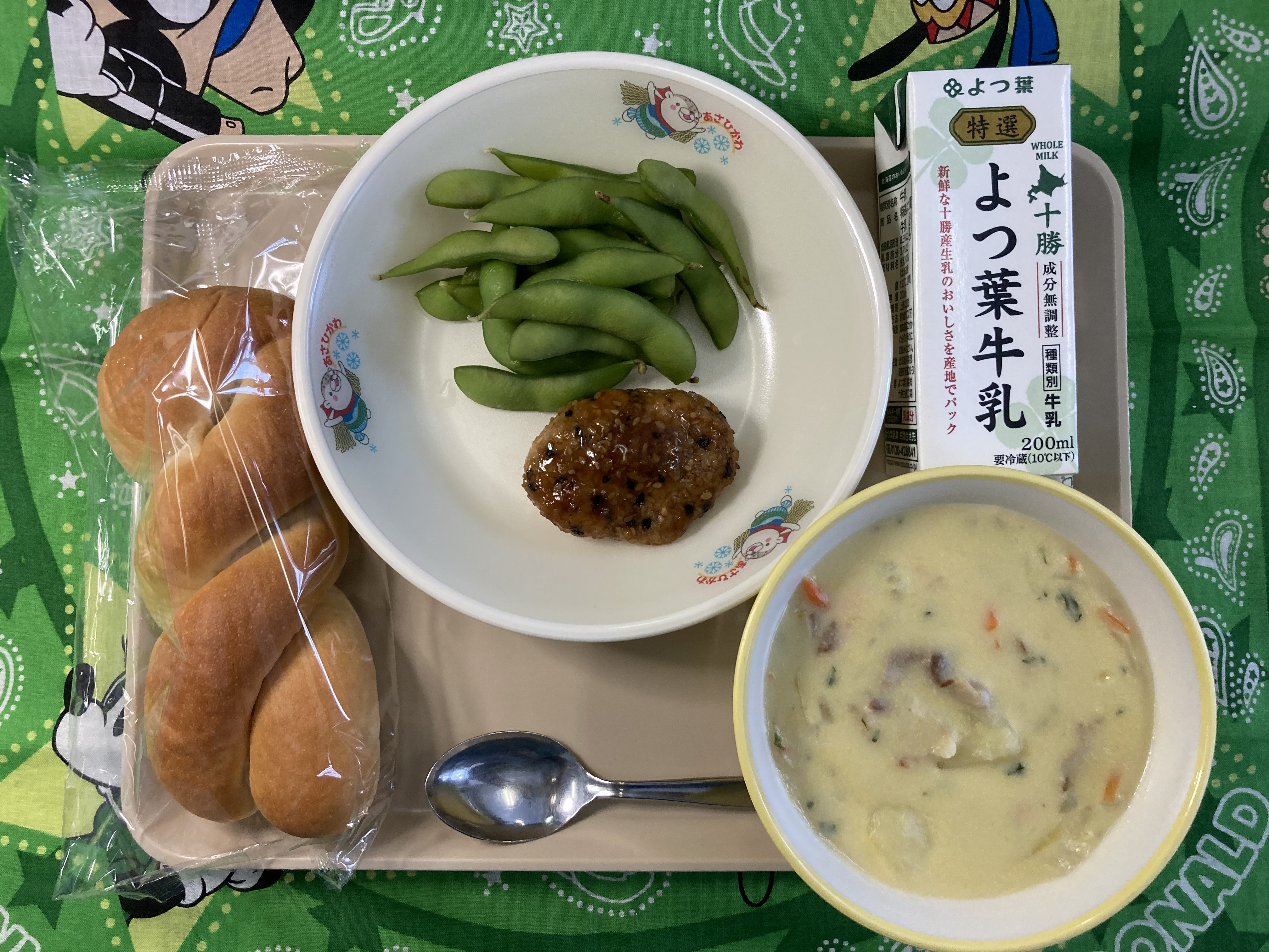 3月7日 米粉ツイストパン 牛乳 ポタージュ 若鶏のごま照焼 枝豆
