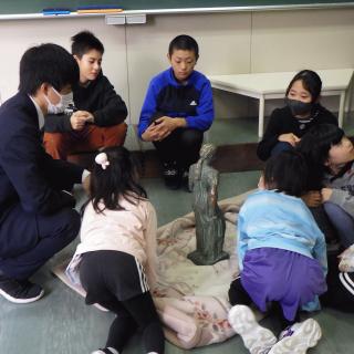 講師の方と一緒に、彫刻をじっくり観察し、彫刻の気になる部分などから、お話をしながら作品への考えを深めていったり、彫刻を触ったり、持ったりして、彫刻の質感や重さを体感したりしました。