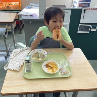 今年度最後の給食は、パンにカレーパンの具をはさんで食べる「カレーパン」