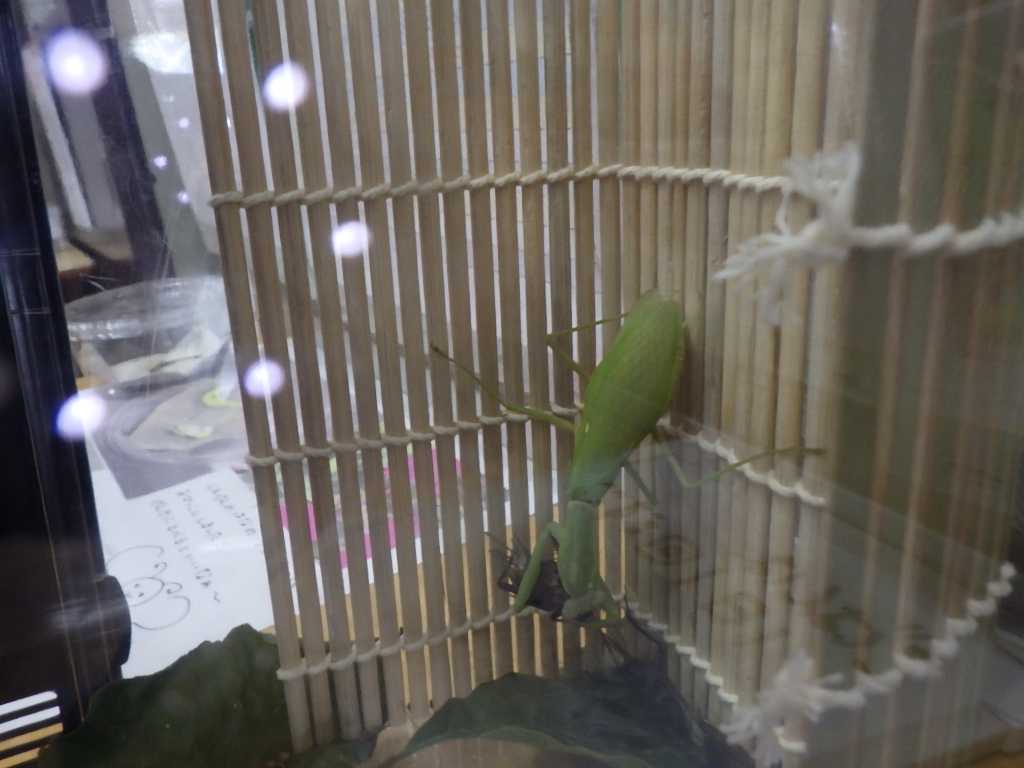 富沢小の仲間~カマキリ 9月から、ワークプラザにてカマキリを飼い始めました。富沢ファミリーの一員として、子どもたちと一緒に過ごしています。 子どもたちも保護者の皆さん、先生方も 「初めて見た!」と驚く声がたくさん! えさは、生きた昆虫。子どもたちが校庭や近くの自然の中で捕まえてきて、毎日元気にお世話しています。