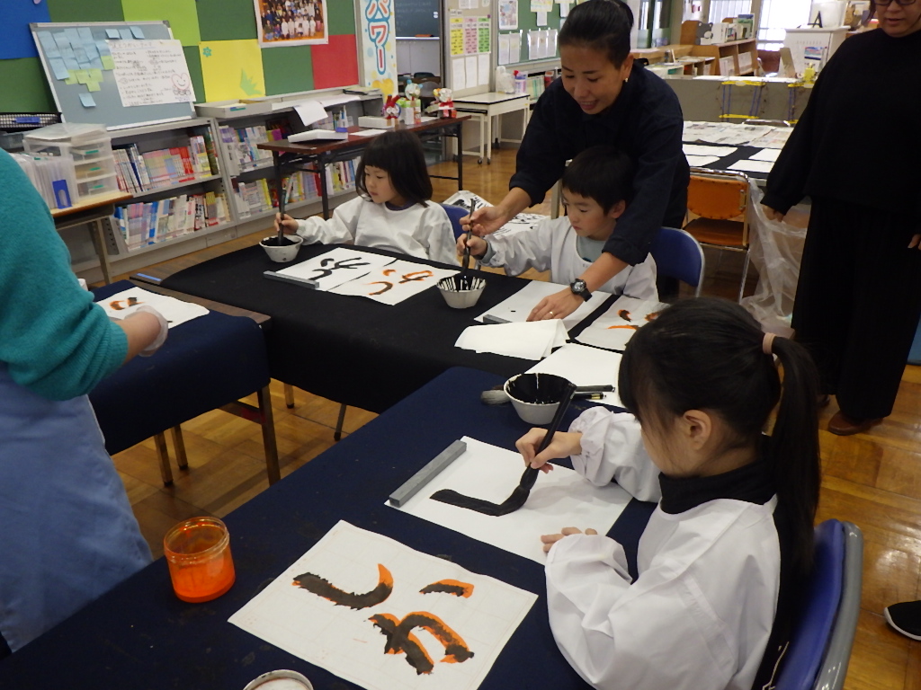 本田先生は、筆の持ち方や運び方など、上手に書くためのポイントをわかりやすく、楽しく教えてくださり、子どもたちはみるみるうちに上達。 集中して筆を走らせる姿が印象的で、どの子も満足のいく作品を仕上げることができました。