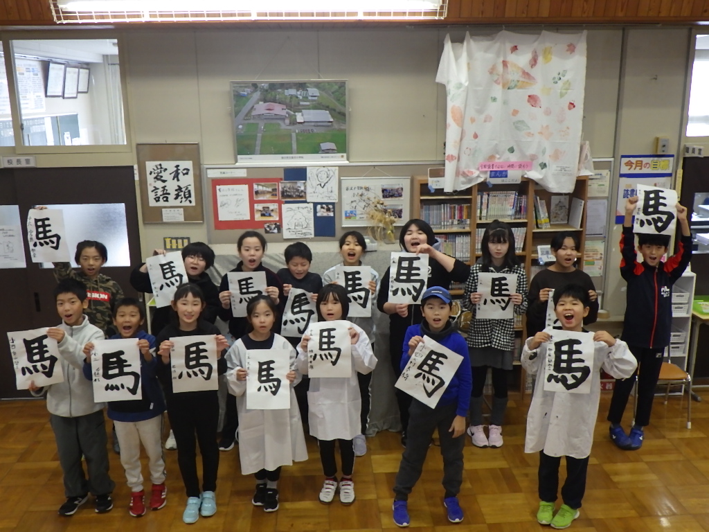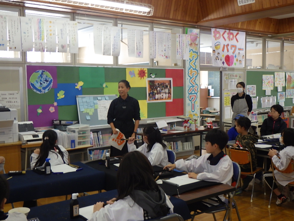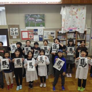 11月11日(火)、本田蒼風先生を講師にお迎えし、書道教室を開催しました。 低学年は「しか」、中・高学年は「馬」をテーマに、それぞれの学年に合った課題に取り組みました。