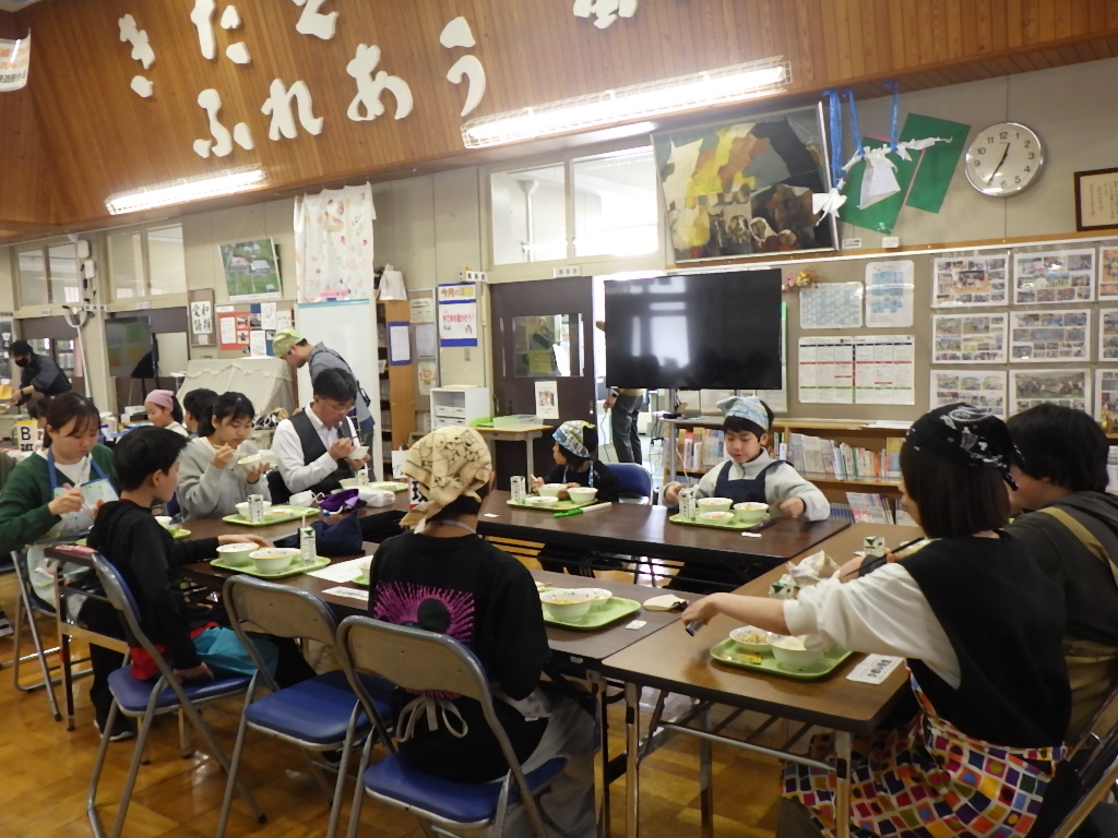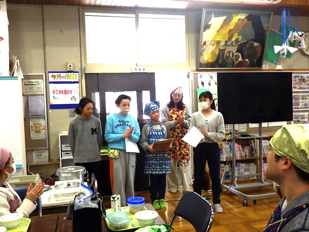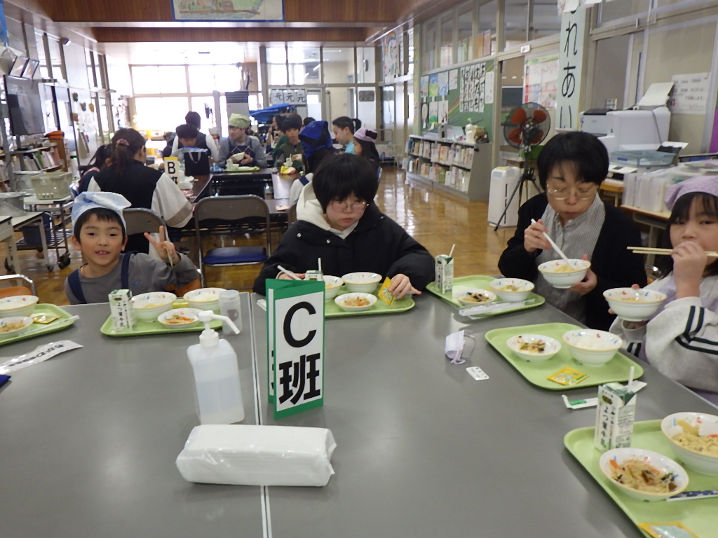 今年度最後のふれあい給食 2月27日(金)は、今年度最後の「ふれあい給食」を行いました。今回は、栄養教諭の山田先生をお迎えし、「スポーツと食事」をテーマに食育の授業をしていただきました。学習のあと、縦割り班ごとに、みんなで給食をいただきました。今年度のふれあい給食はこれで最後となりますが、子どもたちにとって、学びとつながりのある温かいひとときになりました。