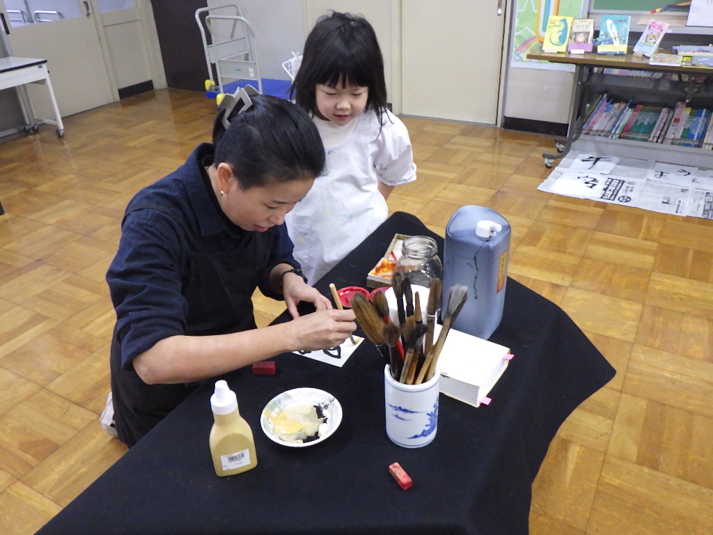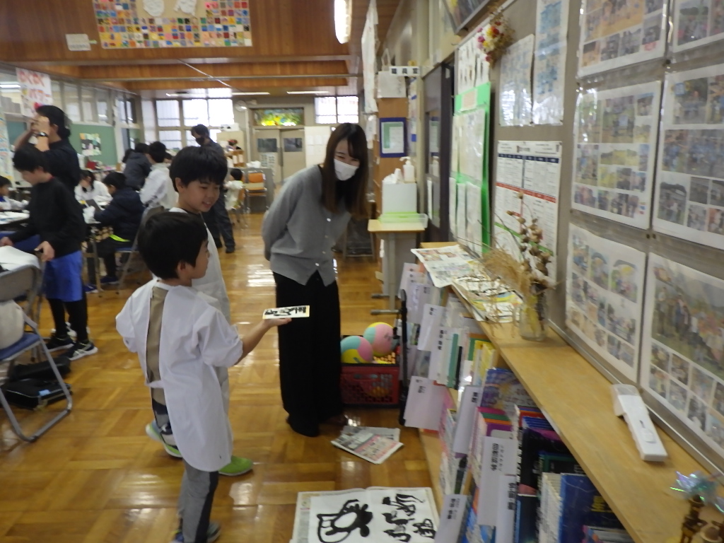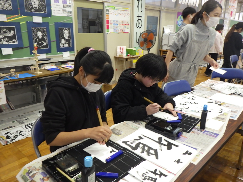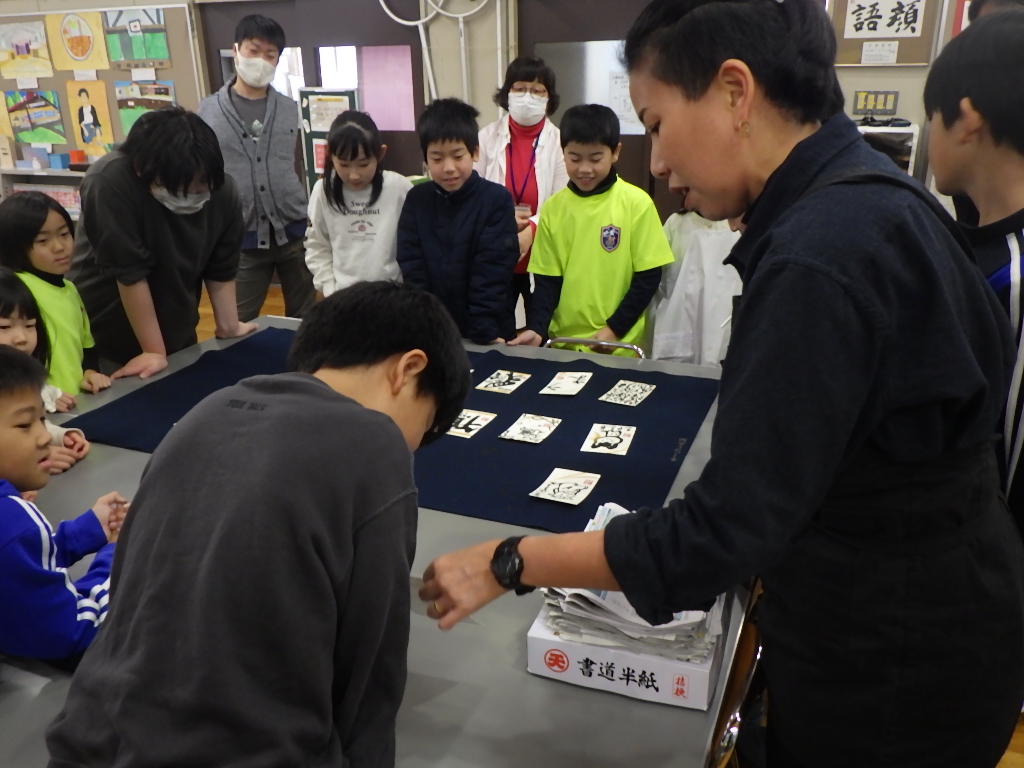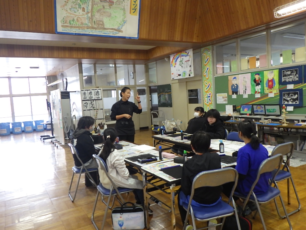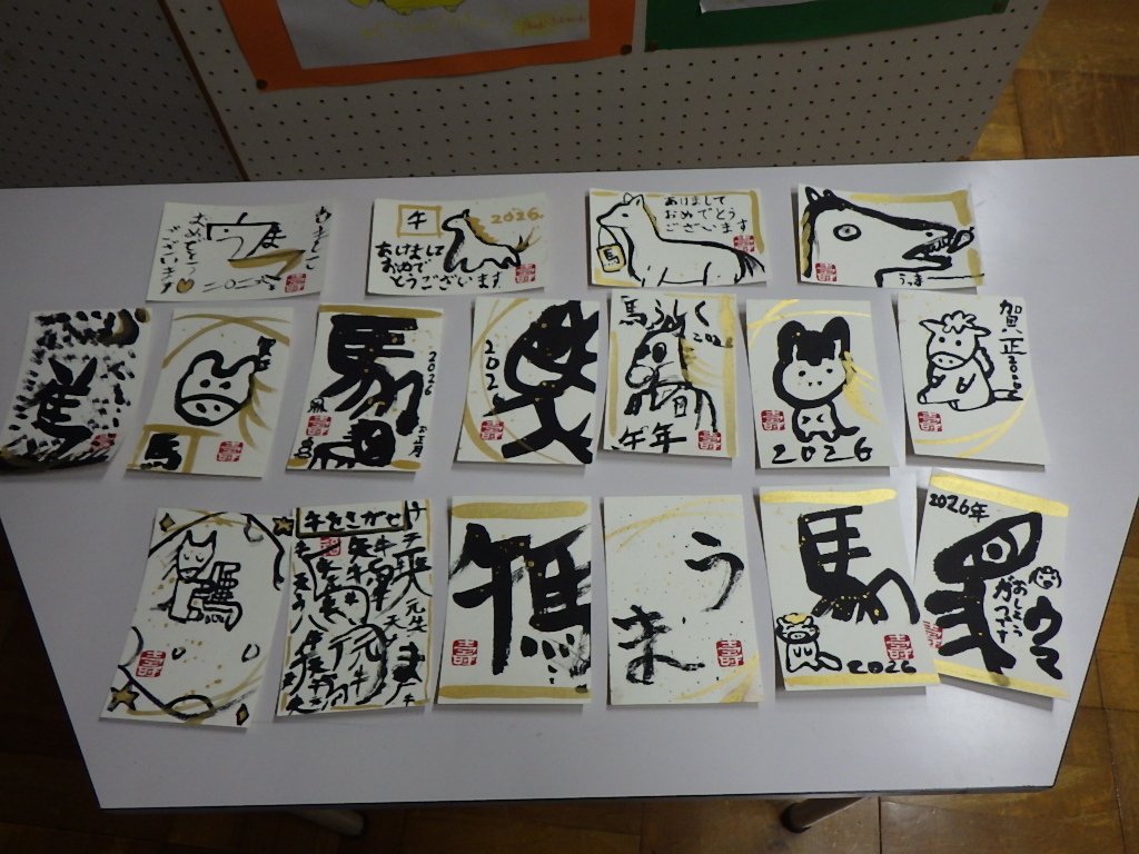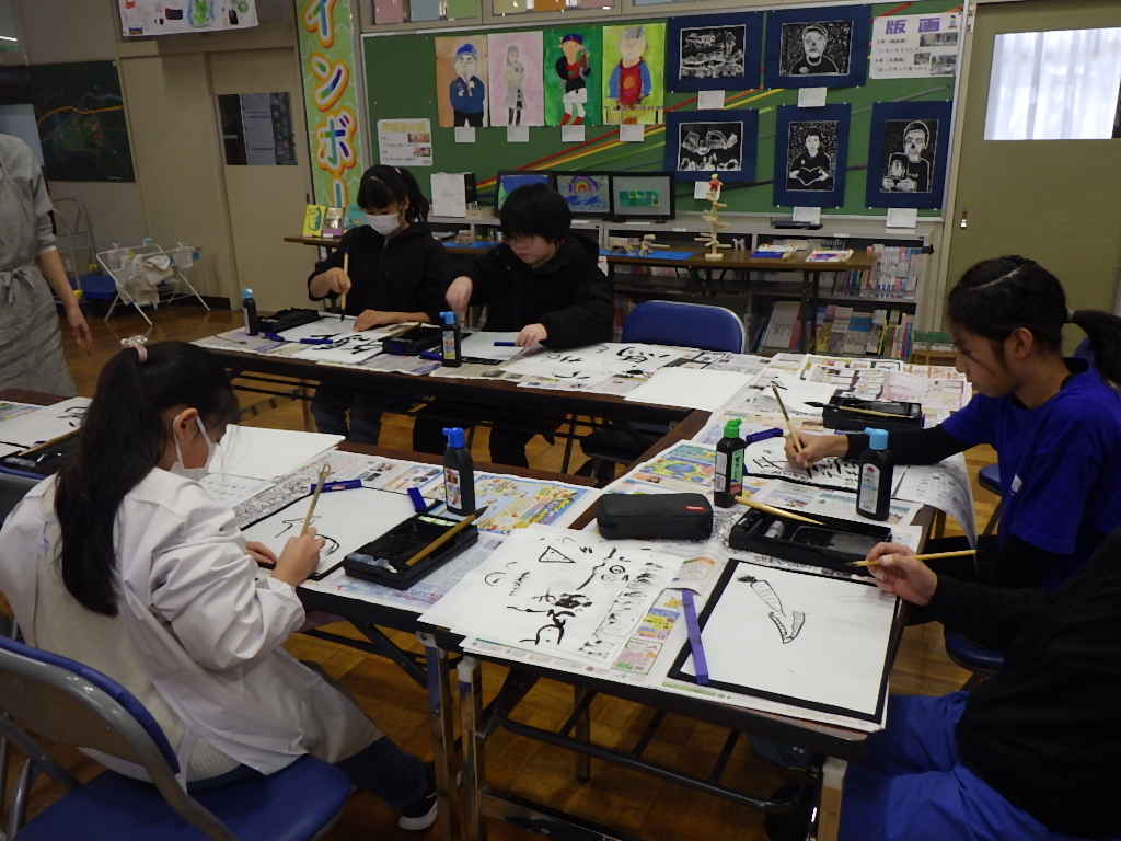 本田蒼風先生を講師にお迎えしてデザイン教室を行いました。授業の初めには「アート」と「デザイン」の違いについて分かりやすくお話しいただき、さらに旭川市がユネスコ創造都市ネットワークに加盟している"デザインシティー"であることも教えていただきました。子どもたちは墨汁と筆を使い、年賀状のデザインを一人ひとり思い思いに考えて書き上げました。仕上げには先生から金色のアクセントと判を押していただき、作品が一層華やかになり、子どもたちは満足そうな表情を見せていました。完成した年賀状は「ふるさと家族」に届けられる予定であり、お正月には、心を込めて作った作品が地域の方々へ温かい気持ちを届けてくれることでしょう。