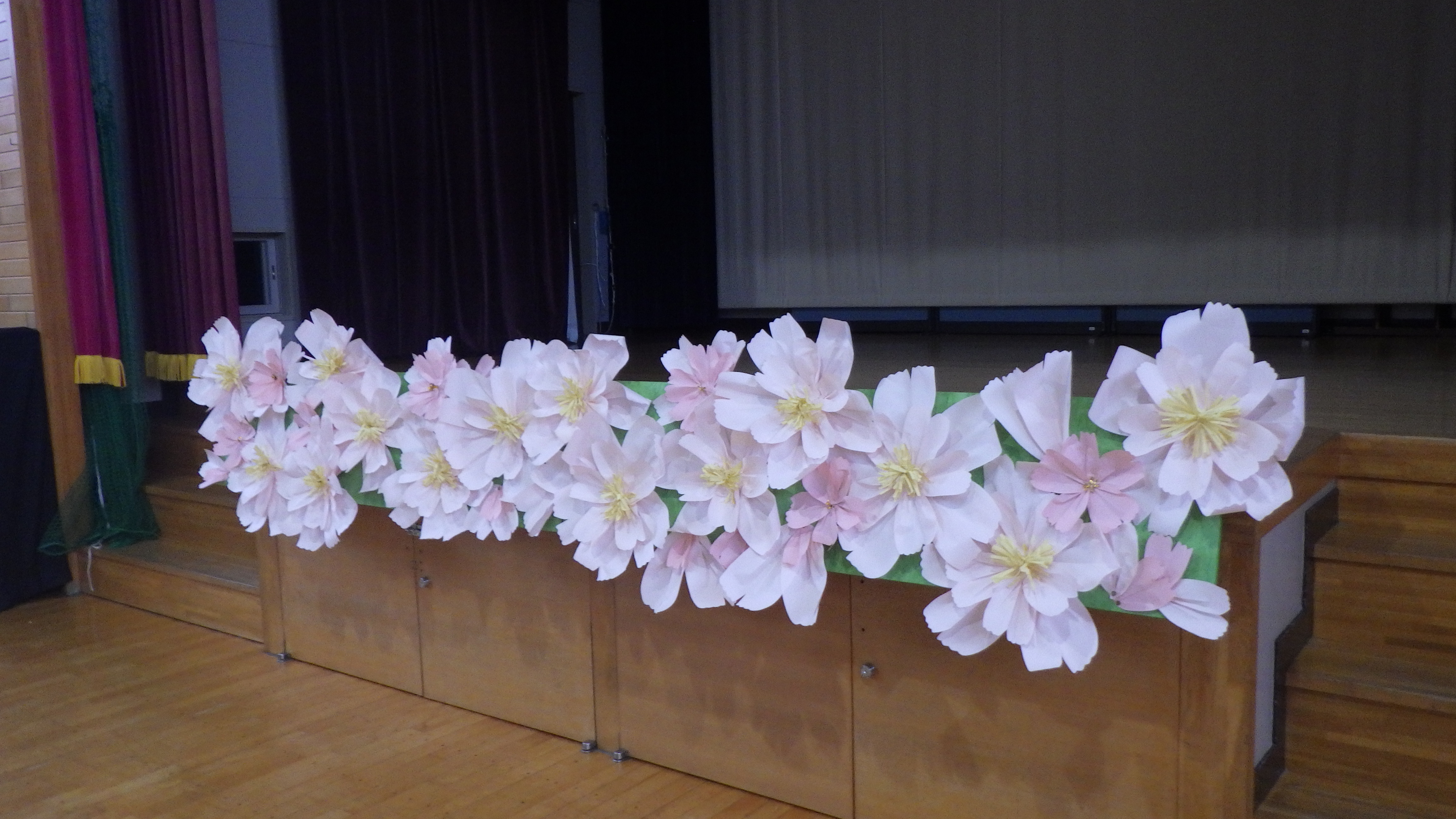 今年の卒業式からアザレアの鉢を購入しないことにしたため、ステージを華やかに彩るために、保護者有志の皆さんが装飾を作成してくださいました。